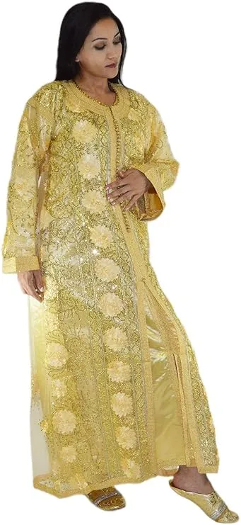 This exquisite Gold Moroccan Wedding Kaftan, which consists of two pieces: the Tahtiya, an inner dress made of fine, shiny fabric that is long-sleeved and modest, and the Dfina (or Fouqia), an outer, more elaborate over-dress that is sheer and richly decorated. Both pieces have a fancy collar and button up the front with traditional closures, making them ideal for Muslim wedding dresses. This gold Islamic bridal dress is covered in lace and measures 56 inches long, with a bust size of 46 inches, ensuring a perfect fit for the bride on her special day.