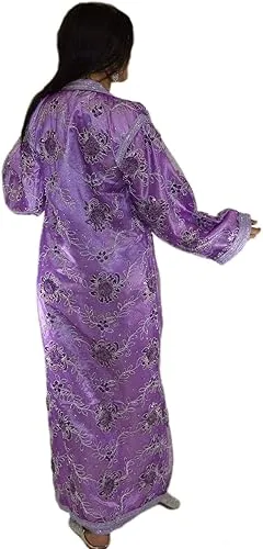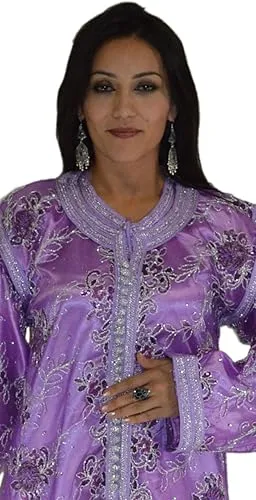 This exquisite Lavender Moroccan Bridal Kaftan, which consists of two elegant pieces: the Tahtiya, an inner dress made of fine, shiny fabric that is long-sleeved and modest, and the Dfina (or Fouqia), an outer, more elaborate over-dress that is sheer and richly decorated with embroidery and metallic threadwork. Both pieces have a fancy collar and button up the front with traditional closures, making them perfect for Muslim weddings, Eid, and other formal events.