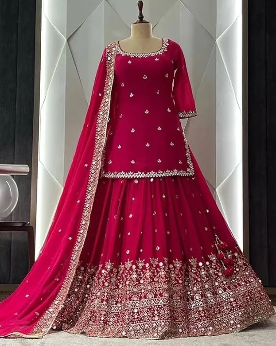 Inspiration: This AI-visualized look demonstrates how you can achieve a hijabi lehenga. Add hijab, then order this lehenga in Rani color: https://amzn.to/3Ne9dXd This Muslim lehenga look features a stunning Fuschia Muslim Lehenga, crafted in luxurious georgette fabric with silver embroidery and sequins. This exquisite readymade lehenga is designed for the perfect bridal moment, ensuring that every Muslim bride radiates beauty on her special day. The ensemble includes a beautifully embroidered chiffon dupatta, making it a true embodiment of elegance and tradition. Available in sizes ranging from 38 and 42 bust, this ready-made lehenga is perfect for modern brides seeking a timeless look.