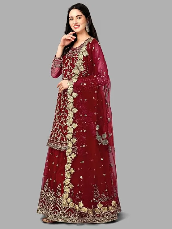 Inspiration: This AI-visualized look demonstrates how you can achieve a Muslim lehenga. Add hijab, then order the Readymade Maroon Muslim Lehenga on Amazon in Maroon: https://amzn.to/3M8zJ3B This Muslim lehenga features an elegant Maroon Muslim Lehenga that is the perfect choice for brides seeking traditional refinement. The lehenga is crafted from net fabric and showcases intricate embroidery, highlighting the richness of maroon and antique gold tones. This stunning ensemble creates a beautiful balance of sophistication and grace, making it easy for your groom to coordinate with. The ready garment sizes range from Small to 3XL, ensuring a comfortable and flattering fit. The kameez length is 40 inches, while the bottom length measures 41 inches. The dupatta of this kurta lehenga is 2.25 meters of embroidered net, making it a standout piece for a grand wedding celebration.