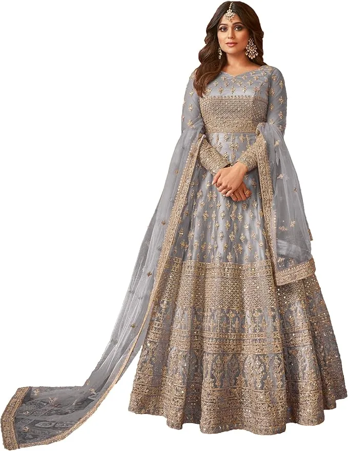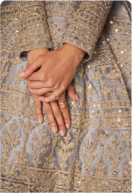 Let your Muslim wedding feature the Silver Muslim Wedding Dress with champagne embroidery, expertly crafted in a harmonious fusion of tradition and modern elegance. This modest wedding dress is a perfect choice for intimate Nikah ceremonies and refined celebrations. Made from delicate butterfly net paired with lightweight santoon, it is available in sizes 36 (XS) to 44 (XL) with lengths ranging from 50 to 57 inches. The silver shade echoes modernity, especially with the champagne embroidery. This dress captures understated beauty necessary for a modern bride while honoring a rich cultural legacy.