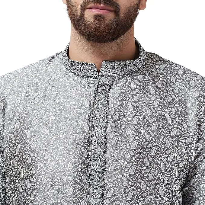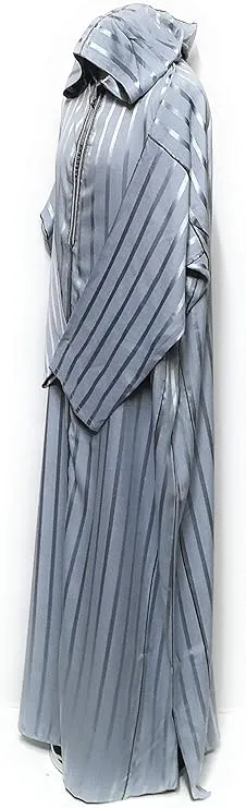 To shop these items on Amazon.com, click the pictures.This collection of silver groom's outfits for Muslims is meant to coordinate with silver bridal looks. The groom can choose a pair of slippers, a kurta set, and a sherwani or waistcoat to complete the ensemble with cultural heritage or simply slip a silver djellaba over his headgear. Islamic culture keeps these garments elegant and modest. There is a hint of fashion influence from the wedding industry to our South Asian Muslim grooms. Elevate your moment with our curated selection, tailored to reflect the dignity and beauty of the American Muslim community, while celebrating the fusion of religious significance, tradition and modernity.